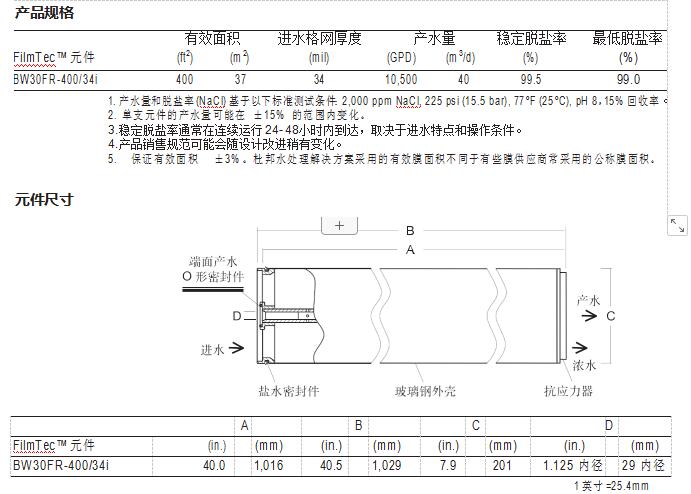 FilmTec™ BW30FR-400/34i 是一款適用于處理高污染水源、同時 具有抗污染性、高脫鹽率和高產水量的抗污染膜元件。