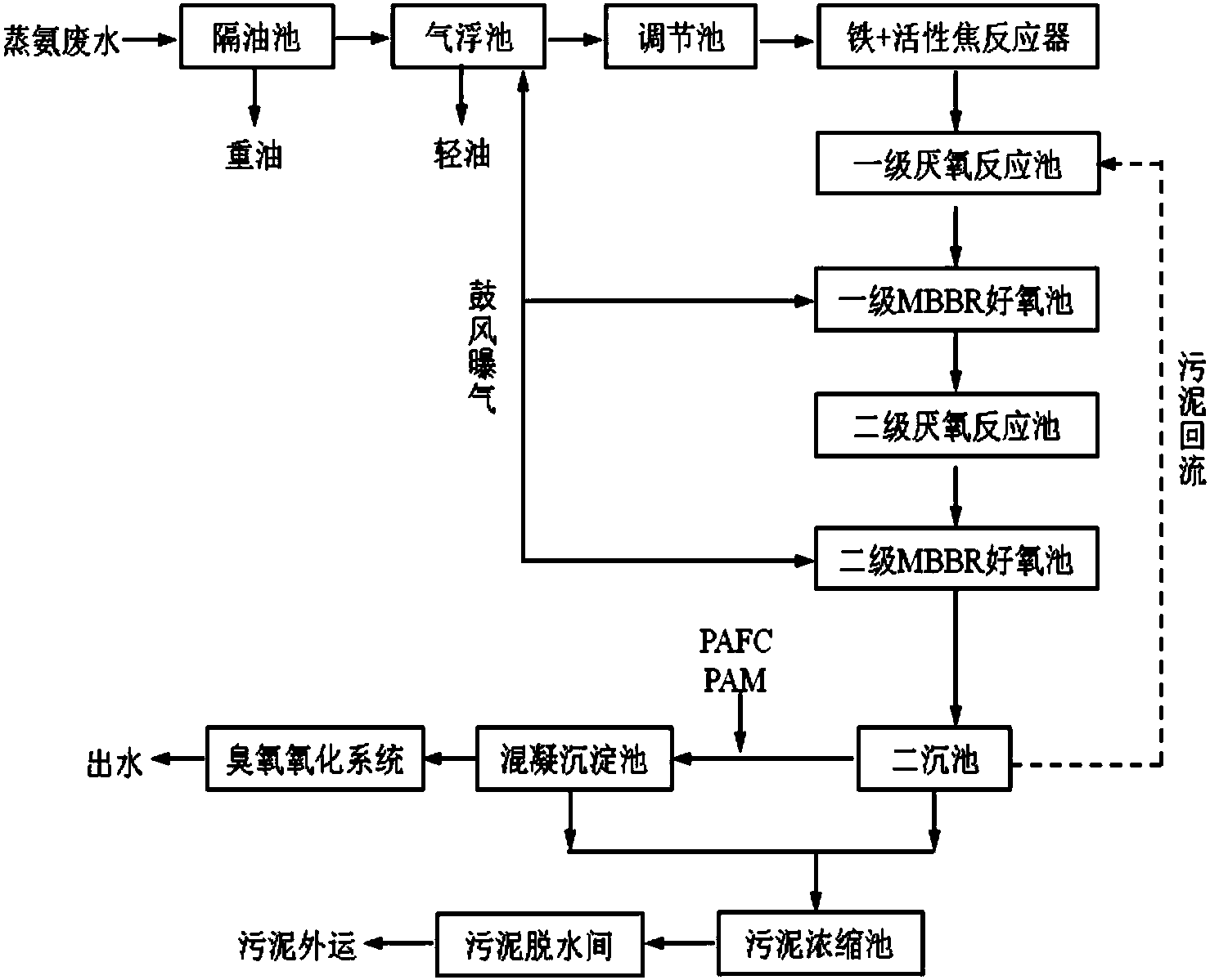 本發明能夠有效地將重油和輕油從焦化廢水中分離出來,實現油品回收;鐵+活性焦反應器能夠對焦化廢水進行微電解作用,提高焦化廢水的可生化性,并且活性焦可以對懸浮物起到吸附作用;兩級厭氧+MBBR好氧反應系統主要對污水進行脫氮處理,降解有機污染物濃度,而且MBBR好氧反應池能夠延長污泥齡、固化及豐富微生物種類,提高系統的硝化性能和抗負荷能力;比較后,經沉淀后的污水進入臭氧氧化系統進行深度處理后,可用作循環水使用;本發明運行穩定,成本低,處理效率高,抗負荷能力強,操作簡單。