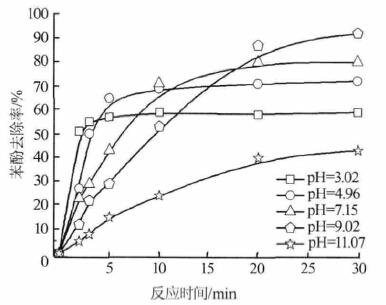 pH=3.02 時,K2FeO4 氧化性能比較強,但卻比較不穩(wěn)定,K2FeO4 還未來得及與苯酚完全反應(yīng)就分解了,與苯酚的反應(yīng)時間短,導(dǎo)致苯酚去除率不高。pH= 9.02 時,K2FeO4 的氧化性不及在pH 較低的情況下高,但穩(wěn)定性較好,相對來說與苯酚的反應(yīng)時間延長了,其對苯酚的氧化分解作用達(dá)到比較大。pH=11.07 時,K2FeO4 的氧化性能比較弱,因此對苯酚的去除效果比較差。