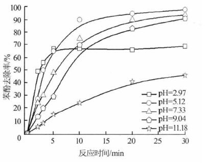 對比圖 1、圖 2 中苯酚去除率曲線的拐點均向右移,即苯酚去除率達(dá)到平緩期的時間變長,說明加入NaClO 后,K2FeO4 的分解速度放緩了,穩(wěn)定性有所提高,和苯酚的反應(yīng)時間變長了。對于K2FeO4- NaClO 體系,pH=5.12 時苯酚去除率比較高,達(dá)到了 98.5%,而單一的K2FeO4 體系,在pH=9.02 時苯酚去除率比較高,為93.1% 。這也說明在pH 較低的情況下,K2FeO4-NaClO 體系中K2FeO4 的穩(wěn)定性增強。
