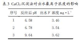 以CaCl2作為化學沉淀劑,出水中氟離子濃度小于4mg·L-1,遠小于排放標準中要求的10mg·L-1,也小于氟化鈣的溶解度8.9mg·L-1,且效果穩定。這是因為當水中含有氯化鈣、硫酸鈣等可溶性的鈣鹽時,由于同離子效應而降低氟化鈣的溶解度,使出水中氟離子濃度大大降低。