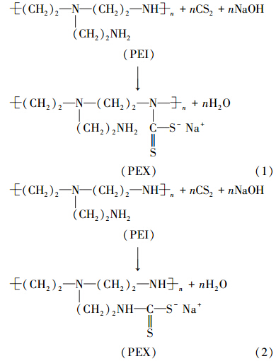 其中PEX是在堿性條件下使聚乙烯亞胺(PEI)與二硫化碳(CS2)發生黃原酸化反應,在其分子上引入二硫代羧基,從而獲得的具有捕集重金屬離子和去除濁度雙重功能的高分子絮凝劑.PEX的制備原理可以用式(1)~式(2)表達.