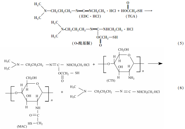 其中MAC是以殼聚糖(CTS)、巰基乙酸(TGA)為原料,以EDC鹽酸(EDC · HCl)為活化劑,通過酰胺化反應在CTS分子上接上對重金屬離子有強配位能力的巰基乙酰,從而合成的具有捕集重金屬和除濁雙重功能的高分子絮凝劑.制備原理可以用式(5)~式(6)表達.