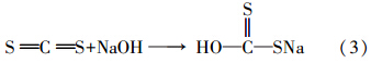采用交聯淀粉為母體,在酸性條件下以硝酸鈰銨為引發劑,以丙烯酰胺為單體,合成交聯淀粉-聚丙烯酰胺接枝共聚物(CSA);又在堿性條件下,使該接枝共聚物與二硫化碳作用,生成交聯淀粉-聚丙烯酰胺-黃原酸酯(CSAX).由于其結構中同時存在重金屬離子的強配位基黃原酸基和具有絮凝功能的聚丙烯酰胺側鏈,因而可同時捕集重金屬離子和去除濁度.其中CSA與二硫化碳的反應可以用式(3)~式(4)表達.