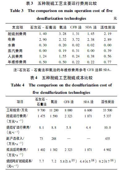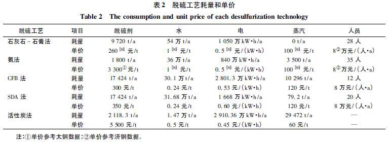 表2和表3比較了五種脫硫工藝運行過程中的單項費用,以下列出了費用消耗由大到小的排序。脫硫劑費用:氨法>活性炭法>SDA法>石灰石-石膏法>CFB法;電費:CFB法>石灰石-石膏法>活性炭法>SDA法>氨法;水費:石灰石-石膏法>氨法>CFB法/SDA法>活性炭法,活性炭法消耗水費為零;蒸汽費用:活性炭法>CFB法>氨法>石灰石-石膏法/SDA法,石灰石-石膏法和SDA法的蒸汽費用為零;人員費用:活性炭法>SDA法>CFB法>氨法>石灰石-石膏法;年維修費用:活性炭法>石灰石-石膏法/氨法>CFB法/SDA法。與其他脫硫工藝相比,氨法脫硫劑消耗量雖然不大,為1800t/a,但其單價較貴,為3300元/t,所以氨法該項支出比較高;除氨法外的脫硫工藝均需要壓縮空氣,所以氨法脫硫工藝支出電費比較少;濕法脫硫工藝耗水量大于半干法,而活性炭干法脫硫過程不使用水;活性炭法脫硫工藝較先進,該法所需人員費用和維修費用均較其他脫硫工藝高。