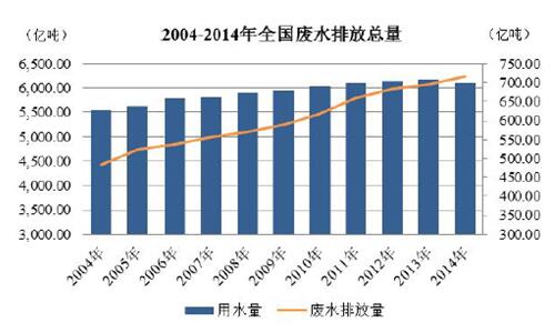國家統計局數據顯示,2004至2014年期間,全國的用水量由5,547.80億噸增至6,094.86億噸,增幅為9.86%,與此同時,全國廢水排放總量由482.40億噸增至716.18億噸,增幅達到了48.46%。