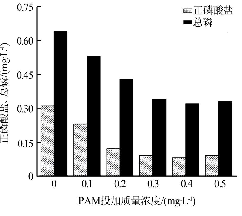 從圖 5可以看出,當(dāng)PAM投加質(zhì)量濃度為0.3 mg/L,經(jīng)沉淀后總磷質(zhì)量濃度可降低至0.4 mg/L以下,正磷酸鹽質(zhì)量濃度降低至0.1 mg/L以下。當(dāng)PAM投加質(zhì)量濃度大于0.3 mg/L,總磷和正磷酸鹽濃度變化趨勢(shì)不明顯。從實(shí)驗(yàn)現(xiàn)象可以看出,與不加PAM相比,加入PAM后形成的絮體體積更大,沉淀時(shí)間減少。但是,過(guò)多加入PAM,不僅會(huì)增加廢水處理藥劑費(fèi)用,同時(shí)還會(huì)增加水體COD〔11〕。因此,實(shí)驗(yàn)確定PAM的比較佳投加質(zhì)量濃度為0.3 mg/L。