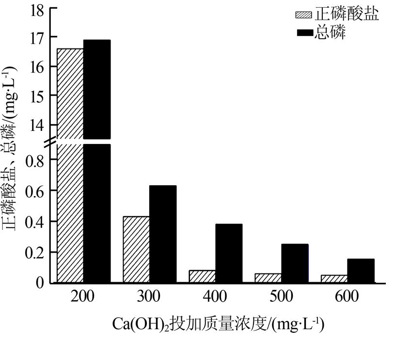 水質(zhì)同2.6,考察了不同Ca(OH)2投加量對(duì)氧化后廢水中磷去除率的影響。實(shí)驗(yàn)所用水樣初始總磷質(zhì)量濃度為50.2 mg/L,正磷酸鹽質(zhì)量濃度為49.9 mg/L。Ca(OH)2的投加質(zhì)量濃度分別為200、300、400、500、600 mg/L,其對(duì)總磷和正磷酸鹽去除的實(shí)驗(yàn)結(jié)果如圖 4所示。