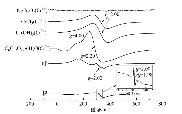 李氏禾葉部的EPR譜圖在g=4.00處出現特征峰,且與C6Cr2O12 · 6H2O特征峰g值一致.由于有機鉻化物如草酸氫鉻、檸檬酸鉻、Cr(Ⅲ)-EDTA在g=4.00~5.50均出現特征峰,因此,李氏禾葉部中的Cr(Ⅲ)以有機酸結合態的形式存在.在g=2.00處附近出現一系列超精細譜線可以歸結于Mn(Ⅱ)和C,但也不排除此信號區域還存在少量的Cr(Ⅲ)信號,因為其出現信號區域的g值與Cr(OH)3產生信號區域的g值一致,所以推測還可能存在Cr(OH)3.李氏禾根部的EPR譜圖在g=2.00處出現明顯的信號區域,與標準物質Cr(OH)3產生明顯信號區域的g值一致,說明李氏禾根部中的Cr(Ⅲ)以氫氧化物的形式存在.結合李氏禾植株中Cr(Ⅵ)僅占1.95%、Cr(Ⅲ)占到了12.20%(圖 2)可知,李氏禾能有效地將Cr(Ⅵ)還原成Cr(Ⅲ).此外,李氏禾根部EPR譜圖在g=2.00和g=1.98處出現兩個連續的信號區域,峰寬為3.89 mT.研究表明,Cr(Ⅴ)順磁信號存在的位置于g≈2.00周圍且峰寬<6 mT,說明李氏禾根部中還同時存在少量的中間價態Cr(Ⅴ).