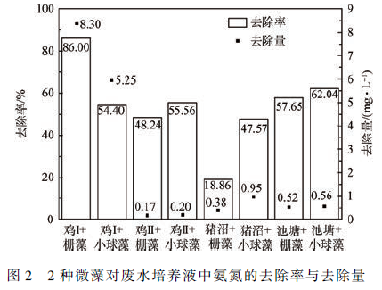 結果表明,普通小球藻在氨態氮初始濃度為21. 2 mg·L - 1 時,對氨態氮的去除率為100% 。顯著高于本實驗中的初始濃度和去除率,這可能與實驗采用的養殖廢水中氮素的形態及含量不同有關,也提示我們今后可以從溫度、光照、氮磷比等多方面對培養條件進行優化,提高小球藻對氨氮的吸收率。