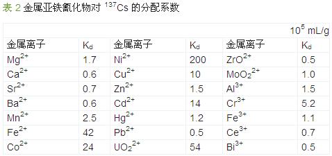 由表 2 可知 ,分配系數(shù)較高的是二價過渡金屬(Ni2+、Fe2+、Co2+、Cd2+、Cu2+) 及 鈾 酰 的 亞 鐵 氰 化 物 。 C. Loos-Neskovic 及 S. Ayrault 等 〔22, 23, 24〕 對 亞 鐵 氰 化 銅的制備方法、 結(jié)構(gòu)組成及其對銫的吸附機理進行深入研究。 研究認為沉淀法、 局部生長法及凝膠生長法可 制 備 出 不 同 結(jié) 構(gòu) 的 產(chǎn) 物 〔24〕,其 中 K2CuFe (CN) 6 具 有 三 斜 晶 體 結(jié) 構(gòu) 〔22〕,這 種 晶 體 結(jié) 構(gòu) 不 是 線 性 的 —Fe—C—N—Cu—鏈狀,而是具有褶皺層的網(wǎng) 狀結(jié)構(gòu) ,其除銫機理是 K+與 Cs+的離子交換。 另一產(chǎn)物 Cu2Fe(CN) 6· xH2O 具有立方晶體結(jié)構(gòu) 〔23〕,兩個鐵原子之間存在空位,這些空位可被水分子或鹽占據(jù) ; 銅原子則占據(jù)兩類不同的位置,其中 Cu 1 原子可與氰化物橋聯(lián)形成絡(luò)合物 ,Cu 2 原子不與氰化物橋聯(lián)因而不穩(wěn)定 。 其對銫的吸附機理包括離子向固相擴散以及形成新的固相兩個步驟。 從對銫的吸附效果來看,Cu2Fe(CN) 6 的吸附速度更快、 吸附容量更高 ,而且穩(wěn)定性好 〔22〕。 V. Avramenko 等 〔25〕將 Me2Fe(CN) 6 和 MeK2Fe(CN)6 (Me=Cu、Co、Ni) 固定于羧基乳膠上形成穩(wěn)定的膠體吸附劑以去除溶液中的銫。 這種新型吸附劑對銫的吸附能力為 1.3~1.5 mol/mol,由于該吸附劑具有高度穩(wěn)定性和較小的粒徑,可穿透多孔介質(zhì) ,因此可用于吸附固 體材料 ( 如受污染的土壤 、廢棄的離子交換樹脂等 ) 中的銫 。 金屬亞鐵氰化物的制備方法簡單、 原料廉價易得,但不同金屬的亞鐵氰化物除銫能力有所差異 ,其中以過渡金屬的 亞鐵氰化物效果比較好,應用中可根據(jù)廢水的特征及處理要求選擇適宜的金屬亞鐵氰化物。