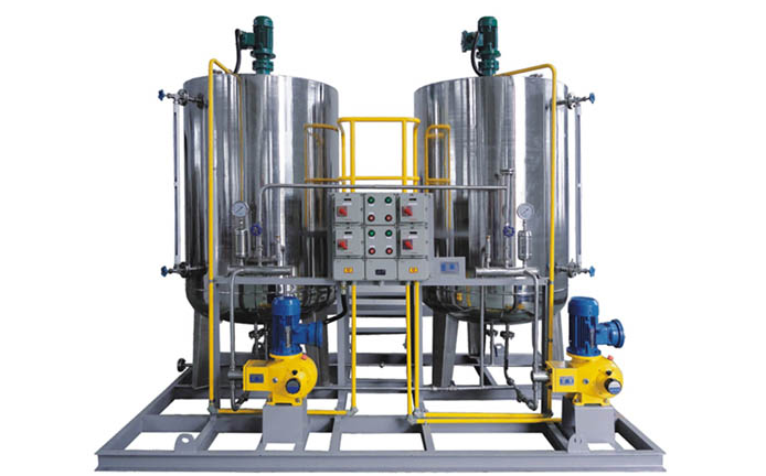 2、加藥裝置組成結構有:溶液箱、液位計、計量箱、攪拌器、加藥計量泵、安全閥、壓力表、控制柜、閥門以及管路集中布置,各部件的材質(zhì)主要分不銹鋼和碳鋼襯膠。