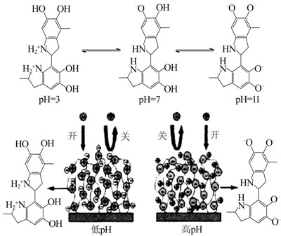 多巴胺(dopamine),一種生物神經遞質。2007年,H. Lee等〔2〕從貽貝的黏附蛋白中獲得啟發,利用多巴胺研究了其在不同有機、無機材料表面的自聚涂覆功能,并成功形成了功能化的改性表面。自此,有關多巴胺在除神經學外的應用報道不斷引起人們的關注。基于多巴胺的黏附性、還原性以及生物相容性,多巴胺及其衍生的復合粒子逐漸被用于各個領域,如抗菌〔3〕、催化〔4〕、生物傳感器〔5〕、細胞成像〔6〕、膜技術、吸附等。盡管多巴胺具體的黏附機理還不是很清楚,但是科研人員普遍認為,這種性能與多巴胺所含有的鄰苯二酚和氨基官能團有關。其中被廣泛接受的解釋有2種,一種是在不同的pH下,多巴胺自聚后所帶電荷不同(見圖 1)〔7〕,從而使得其所附著的材料表現出不同的功能;另一種是在水溶液中,多巴胺的鄰苯二酚基團容易被氧化,生成含有鄰苯二醌結構的醌化合物,多巴胺和其醌化合物發生反歧化反應,產生醌自由基,耦合形成交聯鍵,從而在基體材料表面形成緊密附著的交聯復合〔8〕。這與隨后發現的多巴胺表現出還原性能〔9〕具有一致性。從多巴胺和氧化石墨烯的反應(見圖 2)可直接觀察到,混合了多巴胺的氧化石墨烯經過濾后,顏色變黑,說明氧化石墨烯被還原〔9〕。隨著多巴胺在除神經學領域外應用的增多,需對其作用機理進行深入研究,從而使其得到更廣泛的應用。