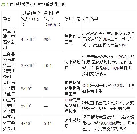 丙烯腈(AN)是一種重要的化工原料,廣泛應(yīng)用于合成纖維、合成樹脂及合成橡膠等領(lǐng)域。2010 年我國丙烯腈的總產(chǎn)量達到約109 萬t,比2009 年增長約11.8%〔1〕。丙烯腈生產(chǎn)過程中會排放大量廢水,廢水中主要含有丙烯腈、乙腈、丙烯醛等物質(zhì),其中腈化物為劇毒物,丙烯腈和丙烯醛是美國環(huán)境保護署規(guī)定的優(yōu)先污染物,若該廢水直接排放,必定會對人類和環(huán)境產(chǎn)生巨大的危害,故對丙烯腈生產(chǎn)廢水的處理至關(guān)重要,部分丙烯腈裝置排放廢水的處理實例如表 1 所示〔2, 3, 4, 5, 6〕。