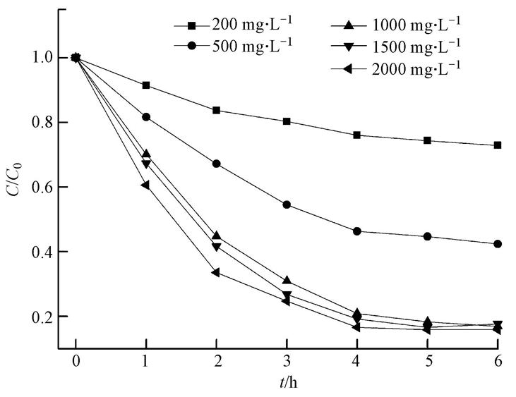 在溫度75 ℃、pH=5的條件下研究了不同初始PS濃度(200~2000 mg · L-1)對ROC中有機物氧化的影響,結果見圖 2.當初始PS濃度從200 mg · L-1上升到1000 mg · L-1時,4 h的反應時間內溶液的COD由98.3 mg · L-1降低至21.5 mg · L-1,表明初始PS濃度對印染ROC中難降解有機物的降解有很大影響,印染ROC中難降解有機物的降解速率隨PS初始濃度的升高而逐漸升高(p<0.05).當初始PS濃度由1000 mg · L-1升高到2000 mg · L-1時,溶液的COD變化不明顯(p>0.05),表明1000 mg · L-1的初始PS濃度產生的SO4· -和· OH已基本上能滿足印染ROC中難降解有機物的分解,過量的初始PS量不僅不能增加難降解有機物的降解速率,而且會造成PS的浪費,因此,確定本反應體系比較佳的PS初始濃度為1000 mg · L-1.本研究的結果與酸活化PS氧化敵草隆的結果一致,有機物的降解速率隨初始PS濃度的升高而升高,當初始PS濃度增加到一定濃度時,有機物(敵草隆)的降解速率升高不顯著.這可能是由于適量的PS產生了足夠反應體系內有機物氧化產生SO· -4和· OH,過量的PS由于被還原后生成了大量的SO42對PS氧化的抑制作用.