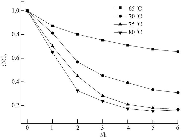 溫度是影響PS活化氧化有機物的一個重要因素,溫度對PS氧化ROC中有機物的影響效果見圖 3,在比較適宜的pH和初始PS濃度條件下,選擇溫度65~80 ℃進行活化.在4 h的反應時間內,ROC的COD在65、70、75和80 ℃條件下從112 mg · L-1分別降低到84.7、42.5、21.5和19.8 mg · L-1,表明ROC的有機物去除效率隨反應溫度的增加而增加(p<0.05).溫度由75 ℃增加到80 ℃時,ROC的COD在反應的4~6 h內,COD變化不大(p>0.05),表明在此反應體系內,75 ℃溫度可以快速活化PS,考慮到經濟成本,確定本研究的適宜的活化溫度為75 ℃.