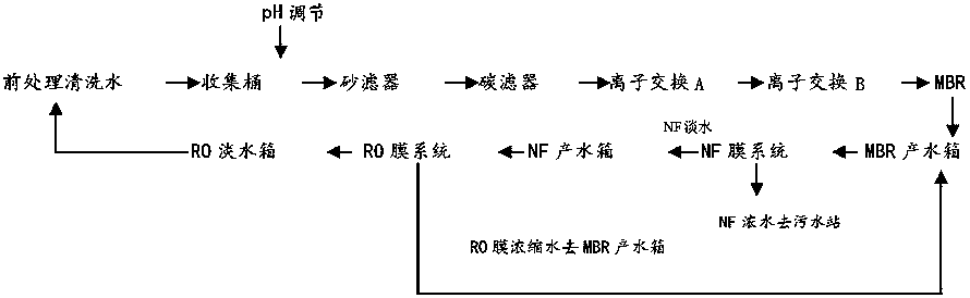 本發(fā)明的電鍍前處理廢水在線回用工藝將離子交換與MBR膜系統(tǒng)、NF膜系統(tǒng)、RO膜系統(tǒng)技術(shù)相結(jié)合,可實(shí)現(xiàn)廢水的循環(huán)使用,減少了新鮮水用量,達(dá)到減排的目的,在生產(chǎn)上的實(shí)際運(yùn)用的效果可以節(jié)省新鮮用水85%,更加環(huán)保,推廣價(jià)值較高。
