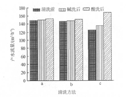清洗前后超濾系統的跨膜壓差變化如圖2所示。從圖2可以看出,3種清洗方法都是有效的,并且方法c的效果比較好,超濾系統的跨膜壓差從0.095MPa下降到0.029MPa。
