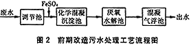 ① 調節池。設計原水調節池有效停留時間為8 h,整個調節池尺寸為20m×10m×2.5m ,內分6格。在原水進調節池前有一小渠道,在渠道中投硫酸亞鐵,使pH為7~9左右。廢水在調節池內有一初沉時間,對池底污泥,紡織廠每年趁春節放假之際清掏外運。