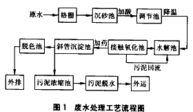 一般情況下,接觸氧化池的出水CODCr和SS還比較高,在進(jìn)入斜管沉淀池時(shí)要投加PAC和PHP,投加量可根據(jù)經(jīng)驗(yàn)或做小試確定。當(dāng)水質(zhì)變化較大時(shí),要加大PAC和PHP的投加量。沉淀池出水色度有時(shí)偏高,還要在脫色池中投加漂白水進(jìn)一步去除色度。因?yàn)槌恋沓夭捎眯惫埽砻尕?fù)荷較小,但出水中SS一般能達(dá)標(biāo)。沉淀池中的污泥排入污泥濃縮池中濃縮,再經(jīng)板框壓濾機(jī)脫水。