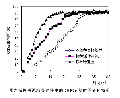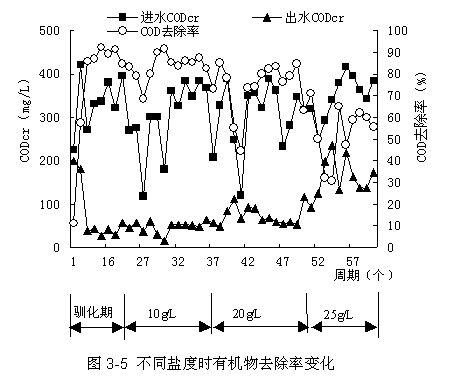 耐鹽微生物:能耐受一定濃度的鹽溶液,但在無鹽條件下生長比較好,其生長也不需要大量無機鹽。 ![]() ![]() 此圖為部分適鹽微生物形態的電鏡圖 4 生物處理高鹽污水遇到的問題 鹽度適應差 傳統活性污泥法馴化處理鹽度低于2%含鹽廢水。 當鹽度環境變為淡水環境時,污泥的適應性會很快消失。 鹽度變化影響大 鹽度在0.5~2%變化通常會對處理系統產生嚴重的干擾。 突然變化鹽度比逐漸變化鹽度對系統的干擾更大 從高鹽變為無鹽產生影響比低鹽環境變為高鹽環境產生的影響要大 降解速率緩慢 隨著鹽度的升高有機物降解速率下降,因此低F/M更適合含鹽廢水的處理。圖3.5為SBR法處理在各鹽度下的處理效果。 污泥流失嚴重 鹽度改變污泥中微生物的組成,改變了污泥的沉淀性和出水SS,污泥流失嚴重.