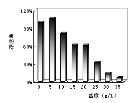 2.2 淡水微生物在不同鹽度下的存活率 不同生活在淡水環境下或者淡水處理構筑物中的微生物接種到高鹽環境下,僅有部分微生物存活。這是鹽度對微生物的一種選擇。將淡水微生物的存活率定義為100%,當鹽度超過20g/L,其存活率低于40%。因此,當鹽度超過20g/:L,一般認為用不同淡水微生物無法進行處理。