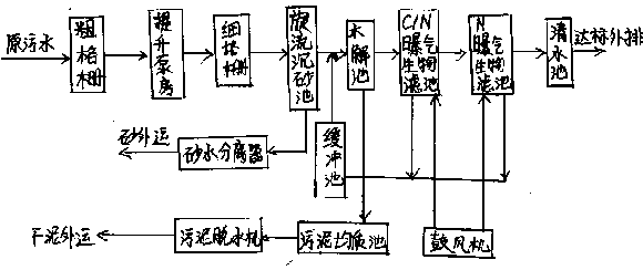 污水先經過粗格柵,以去除污水中大塊的懸浮物,再流入提升泵房的集水池,由潛污泵提升至旋流沉砂池進水渠上的細格柵,進一步去除細小懸浮物,并經計量后進入旋流沉砂池,以去除污水中的細小砂粒。沉淀下來的砂粒經砂水分離器分離,干砂外運。砂水分離后的污水流入提升泵房集水池。經沉砂池處理后的污水自流入水解酸化池。水解酸化池將截留污水中大部分的懸浮物并將其中的部分有機物進行降解,且可將大分子的有機物水解為小分子的有機物。水解酸化池的出水自流入C/N上向流曝氣生物濾池進行有機物的降解和硝化處理。C/N濾池出水進入N濾池進行脫氮處理,N濾池出水進入清水池,至此即可達到排放標準,或排放或回用(若有需要可設消毒池)。