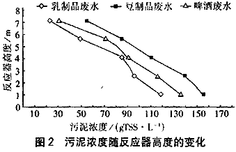 厭氧反應(yīng)器中的污泥顆粒化程度較好,經(jīng)2年運(yùn)行后,從反應(yīng)器各取樣管取樣測(cè)定污泥濃度的結(jié)果見圖2。