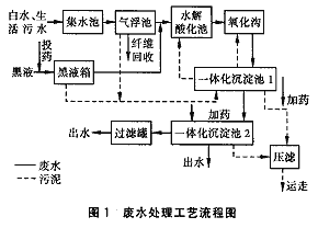 廣西某公司是一采用毛竹為原料的造紙廠,其廢水主要來(lái)源于堿液浸泡(40%燒堿)后水洗產(chǎn)生的黑液和抄紙機(jī)廢水——白水。其中,白水連續(xù)排放(1 200t/d),COD為700~1 200mg/L,pH值為7.2~9.5;黑液間歇排放(100t/d),COD為12 000~24 000 mg/L,pH值為9.2~11.5。此外,還有部分生活污水(約100t/d),COD為200mg/L。廢水主要成分有:纖維、纖維素分解生成的糖類、醇類、有機(jī)酸、木質(zhì)素及其衍生物,少量的樹脂酸、脂肪酸等。