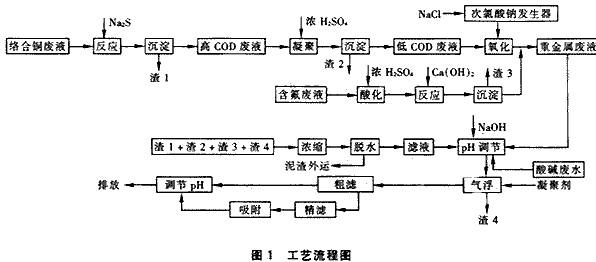① 絡合銅廢液主要是化學鍍銅廢液,加入Na2S破壞銅絡合物,使Cu2+形成CuS沉淀去除。除Cu后含COD的出水再做后續處理。