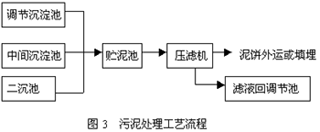 廢水由水渠進入調節沉淀池,調節水質、水量均勻并預沉部分較大顆粒的懸浮物后進入UASB反應器。通過厭氧微生物的作用去除大部分的有機物。出水進入一級生物接觸氧化池進行好氧生化處理,然后進入中間沉淀池進行泥水分離再進入二級生物接觸氧化池進行好氧生化處理。出水加入混凝劑PAC和絮凝劑PAM進行混凝沉淀。二沉池出水達標排放或回用。 此工藝中UASB消化大量污泥。只有調節池。中間沉淀池、二沉池中產生污泥,且量不大疏水性好。故采用污泥通過管道進入貯泥池,然后由泵打入壓濾機房,通過壓濾機壓濾后脫水,泥餅外運填埋或作農肥處理。貯泥池上清液和壓濾機房濾液回流至調節沉淀池進行處理。 3 主要構筑物及技術參數