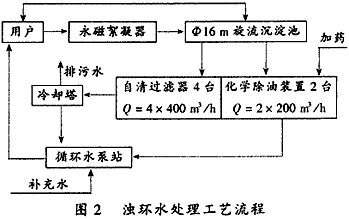 該工藝的特點是流程簡單、投資省、占地小、管理方便。以自清洗過濾器和化學除油裝置代替機械設備除油流程中的二次沉淀池和壓力過濾器。既能去除浮油,又能去除乳化油,同時也能去除懸浮物,達到除油泥雙重目的。