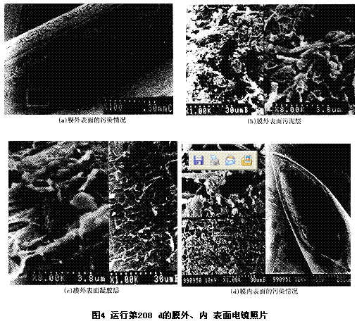 為了解造成膜污染的原因,運(yùn)行第208 d時剪下一段膜絲進(jìn)行電鏡觀察(見圖4)。可以看出, 膜外表面污泥沉積情況很不均勻(圖4a)。在膜絲內(nèi)部負(fù)壓和膜面紊流形成的剪切力等雙重作用下,有些污泥在膜外表面的局部沉積下來,這些沉積污泥由絲狀真菌、放線菌、球菌和桿菌組成。絲狀真菌表面輪廊清晰,產(chǎn)生的分泌物較少,而其余菌種周圍都有厚厚的一層分泌物。這些分泌物不僅對凝結(jié)菌膠團(tuán)起到了重要作用(圖4b),還附著于膜表面或進(jìn)入膜的孔道成為膜表面凝膠層的重要組成物質(zhì)(圖4c)。另一方面凝膠層對膜外表面的污染相當(dāng)普遍,整體來看形成得相對均勻,但從小范圍來看厚度差異較大,變化于0~5μm之間(圖4c)。