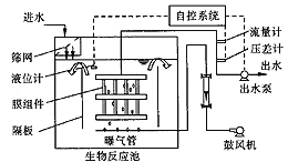 一體式中空纖維膜—生物反應(yīng)器的中試裝置設(shè)在清華大學(xué)東北浴室附近,用于處理學(xué)生浴室的洗浴污水,其工藝流程如圖1所示。整個裝置主要由生物反應(yīng)池和膜組件兩部分組成。生物反應(yīng)池尺寸為0.9 m×0.93 m×2 m,有效容積為1.5 m3,內(nèi)部被隔板分為升流區(qū)和降 流區(qū)兩部分。聚乙烯中空纖維微濾膜組件共有8塊,膜總面積32m2,分兩層置于反應(yīng)池升 流區(qū)。膜組件下設(shè)有穿孔管,曝氣量控制在35~50 m3/h。壓差計用于監(jiān)測在運(yùn)行過程 中膜過濾壓差的變化。液位控制器用于控制生物反應(yīng)池液面使之恒定。電子流量計用于測定膜出水的瞬時流量和累計流量。