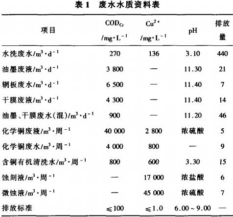 依據(jù)廠方中期規(guī)劃,廢水處理系統(tǒng)的規(guī)模為1500m3/d,工期工程為500m3/d。設(shè)計參數(shù)為:pH 3.50,Cu2+ 80mg/L,BOD5 200mg/L,COD 300mg/L,SS<200mg/L,酸化廢液22m3/d;處理后的出水達(dá)到GB8978-1996二級和廣東省廢水排放二級標(biāo)準(zhǔn)。廢水水質(zhì)見表1。